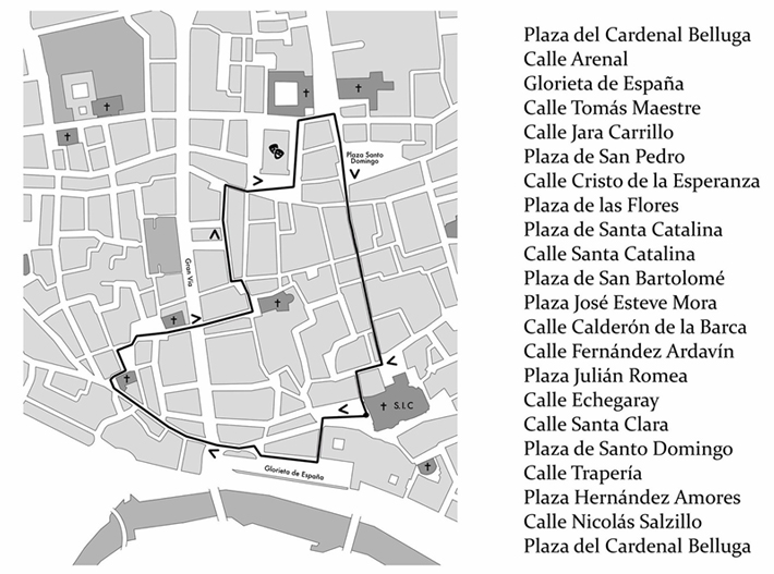 El itinerario por el que avanzará la procesión será el siguiente, tal como publica la propia Delegación de Hermandades y Cofradías.
